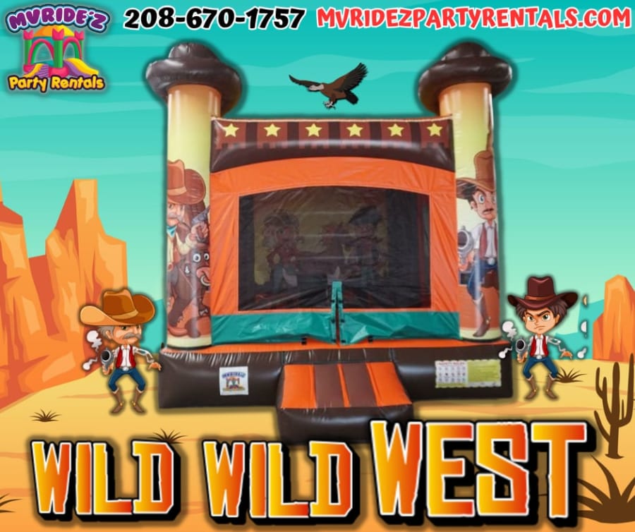Wild Wild West theme bounce house will bring out the cowboy/cowgirl out of the kids! This bounce house has an inflatable bull inside to be played with for even more fun! Delivery available to Twin Falls, Burley, Heyburn, Paul, Rupert, Jerome, Murtaugh, Hazelton, Hansen and nearby areas. Please contact us if you don’t see your delivery area as we may be able to service your area for additional fees.Contact MVRidez Party Rentals