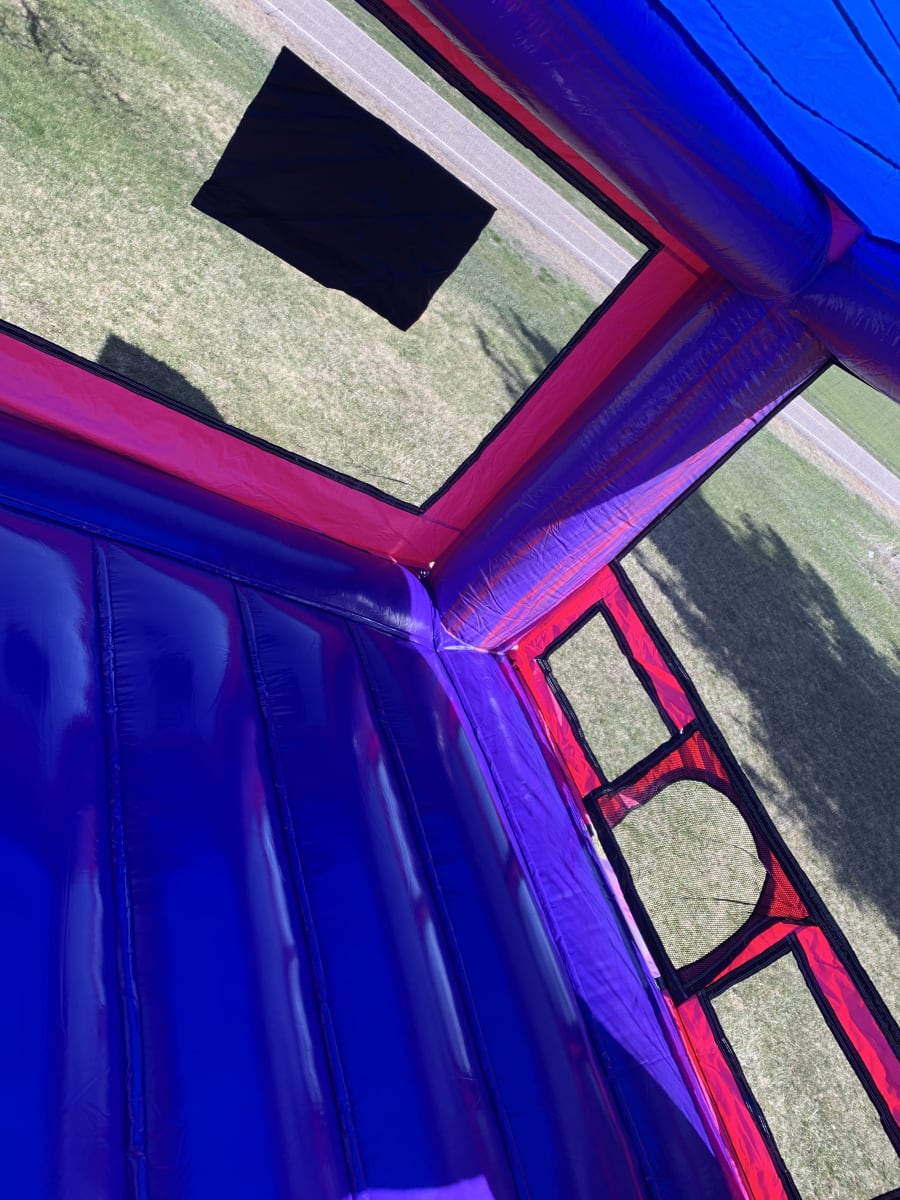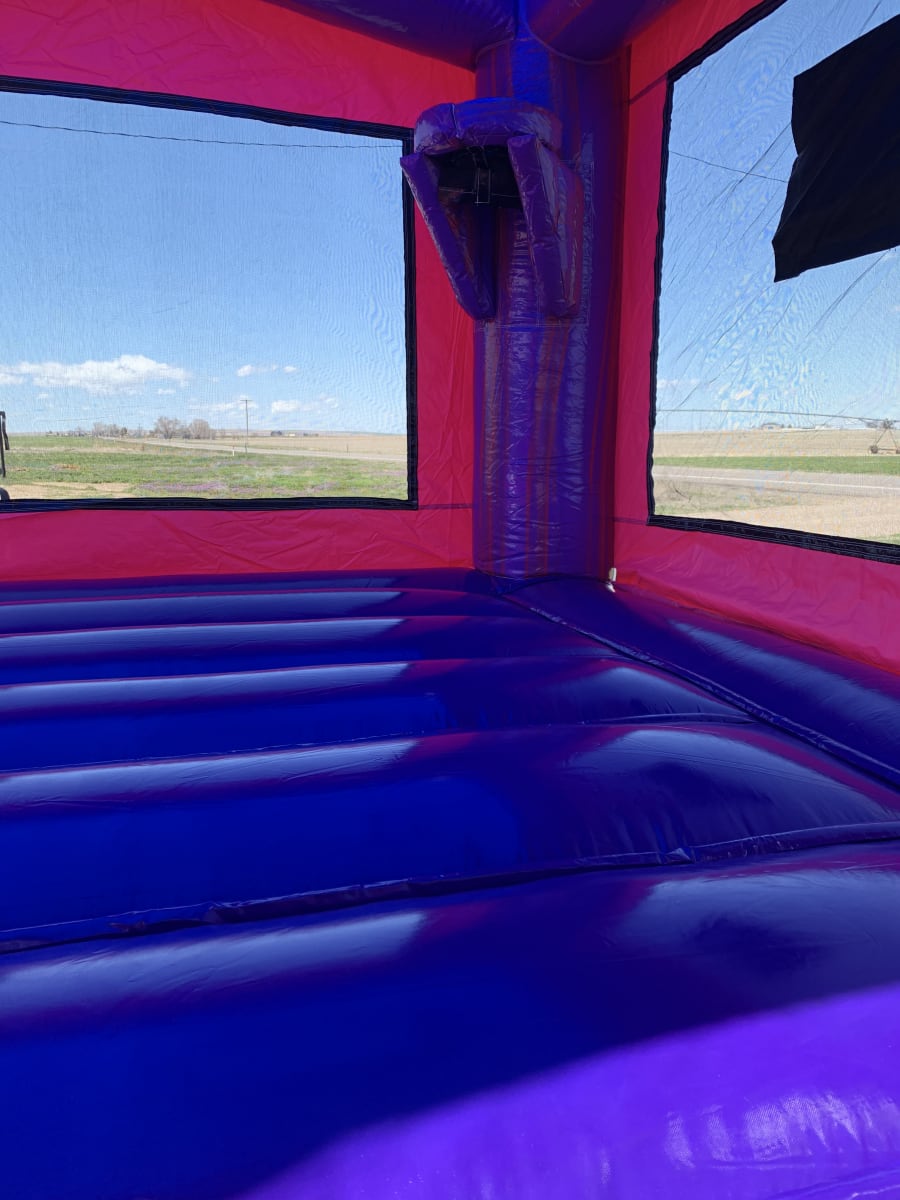 14x14 Princess Playhouse bounce house. Purple with pink blended in and banner attachment with a basketball hoop to complement the big bouncing area for endless fun! Perfect for any princess party! Delivery available to