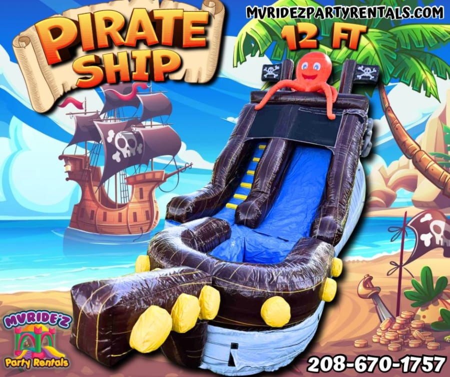 Welcome aboard the Pirate Ship! 🏴☠️ Our new Pirate (12ft Single Slide) is the perfect addition to any outdoor event or party. Let your little ones set sail on this thrilling inflatable slide and embark on an exciting adventure. With its vibrant pirate ship design and cool water slide feature, this inflatable is sure to be a hit with kids of all ages.